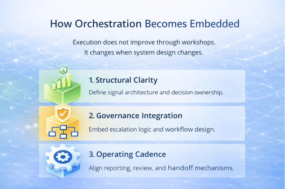 Execution improves temporarily when effort increases. It improves permanently when structure changes. Orchestration becomes embedded through three deliberate design layers.